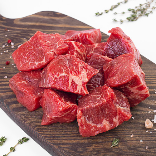 Не знаете, что приготовить? Запасайтесь нашими мраморными кубиками из мраморной говядины Прайм Экстра, и у вас всегда будет под рукой превосходная говядина для приготовления быстрых и вкусных блюд. Наши мясники нарезают кубки из премиальных отрубов Рибай или Стриплойн, а также из альтернативного отруба Hanging Tender, он же Стейк Мясника. Идеально подходят тушения, томления или быстрой обжарки на сковороде. Они сочные, нежные и ароматные. Закажите сегодня и украсьте свои повседневные блюда!